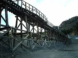 The Idarado Mine was a mining operation in the San Juan Mountains of Ouray County, Colorado near the now-ghost town of Guston, producing primarily lead, zinc and silver along with small amounts of gold and copper. The mine is within the Sneffels-Red Mountain-Telluride mining district. The remains of the operation are visible from the Million Dollar Highway, north of Red Mountain Pass, between Ouray and Silverton, Colorado. The tunnels of the Idarado extend some 5 miles (8 km) west under 13,000 foot (4,000 m) mountains to the Pandora Mill near Telluride, a trip of more than 60 miles (100 km) by highway.