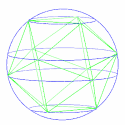 An ideal polyhedron can be constructed as the convex hull of a finite set of ideal points of hyperbolic space, whenever the points do not all lie on a single plane. The resulting shape is the intersection of all closed half-spaces that have the given ideal points as limit points. Alternatively, any Euclidean convex polyhedron that has a circumscribed sphere can be reinterpreted as an ideal polyhedron by interpreting the interior of the sphere as a Klein model for hyperbolic space.[1] In the Klein model, every Euclidean polyhedron enclosed by the sphere represents a hyperbolic polyhedron, and every Euclidean polyhedron with its vertices on the sphere represents an ideal polyhedron.[2]