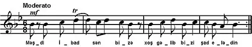 The parody portrait of this unlucky groom is continued in subsequent passages; for example, the traditional melody "Darchiny" becomes a comic song for Mashadi Ibad and Rustam bey in duet. This melody is also now known as "Mashadi Ibad".[13] Another duet of Mashadi Ibad with Rustam bey is pompous and march-like, suggesting the smug merchant.