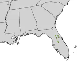 The plant is currently known from fewer than 20 occurrences in Central Florida, within Polk, Marion, Lake, Volusia, and Seminole Counties.[1] It is mainly threatened by the loss of its habitat, particularly changes in local hydrology, but it is also sometimes wild-harvested for use in cultivation.[1]