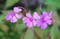 Impatiens flaccida is a species of flowering plant native to the Western Ghats in India and to Sri Lanka. It is an erect or decumbent herb with thin stems growing to 50 cm (20 in) in length. They root at the lower nodes. The alternate leaves are ovate-lanceolate, growing 3 to 8 cm (1.2 to 3.1 in) long and 2 to 3.5 cm (0.79 to 1.38 in) wide. The flowers are light purple with dark eyes, and are 3 to 4 cm (1.2 to 1.6 in) wide.[1]