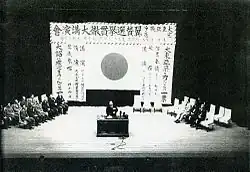 The Imperial Rule Assistance Association (Japanese: 大政翼贊會/大政翼賛会, Hepburn: Taisei Yokusankai), or Imperial Aid Association, was the Empire of Japan's ruling political organization during much of the Second Sino-Japanese War and World War II. It was created by Prime Minister Fumimaro Konoe on 12 October 1940, to promote the goals of his Shintaisei ("New Order") movement. It evolved into a statist, para-fascist[13] ruling political party which aimed at removing sectionalism and factionalism from politics and economics in the Empire of Japan, creating a totalitarian one-party state in order to maximize the efficiency of Japan's total war effort against China and later the Allies.[19] When the organization was launched officially, Konoe was hailed as a "political savior" of a nation in chaos; however, internal divisions soon appeared.