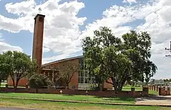 Our Lady of the Southern Cross Catholic Church is on the western corner of George and Elizabeth Streets (28°24′49″S 151°04′50″E / 28.4136°S 151.0806°E).[28]
