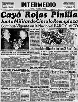 The political situation reached a critical point when a national strike was organized by most sectors of the Colombian society on May 5, 1957. Mass media, banking, industry, commerce, transport and other groups of the economy ceased their activities.[16] Rojas Pinilla announced his resignation, designated as a replacement a Military Junta and escaped from the country on May 10, 1957. That same day Intermedio and its colleague El Independiente (issued as a substitute of El Espectador) released extraordinary editions, with the breaking news on the end of the dictatorship.