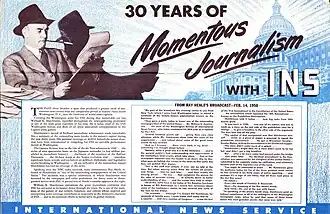 Among those who worked for INS were future broadcasters William Shirer, Edwin Newman, Bob Clark, Freeman Fulbright, and Irving R. Levine, who in 1950 covered the outbreak of war in Korea for INS.[13] Marion Carpenter, the first woman national press photographer to cover Washington, D.C., and the White House, and to travel with a US president, also had worked for the INS.[14] The INS also counted among its ranks other famous journalists, including Jack Lait, Damon Runyon, Karl Henry von Wiegand, Otto D. Tolischus, Dorothy Thompson, Hubert Renfro Knickerbocker, Pierre J. Huss, Richard Tregaskis, Max Jordan.[2]