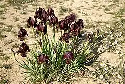 Within the Yeruham Iris Nature Reserve, it grows with mounds of Echiochilon fruticosum, the blue Siberian lily Ixiolirion tataricum and a hyacinth relative called Leopoldia longipes subsp. negevensis.[10] It is normally found in groups of plants, with 20 or more flowers, all blooming at the same time.[3]