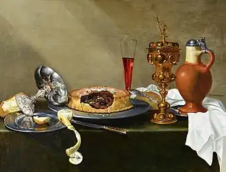 - ^ a b Isaac Wigans, A still life with a silver tazza, a pie, a peeled lemon, a flute glass, a goblet and an earthenware jug on a draped table at Galerie Lowet de Wotrenge