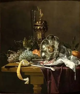 - ^ Isaac Wigans, A pie and a partially peeled lemon on pewter platters, a silver tazza, a silver-gilt cup and cover, a knife, a tankard, a wine glass and a linen cloth on a draped table at Christie's
