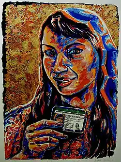 Isabel Martinez created several mixed-media series, ceramics, paintings, and other forms of art which includes VG Got her Green Card,[2] 2001.