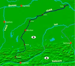 The Isar (pronounced [ˈiːzaʁ] ) is a ⓘriver in Austria and in Bavaria, Germany. Its source is in the Karwendel mountain range of the Alps. The Isar river enters Germany near Mittenwald and flows through Krün, Wallgau, Bad Tölz, Munich, and Landshut, before reaching the Danube near Deggendorf. With 295 km length, it is among the longest rivers in Bavaria, and it is Germany's second most important tributary of the Danube.