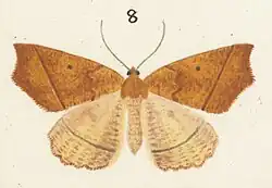 The expansion of the wings of the male is 1+1⁄4 inches; of the female 1+5⁄8 inches. The fore-wings of the male are rich reddish-brown, mottled with darker; there are several small white marks on the costa; a black discal dot, and an almost straight white transverse line beyond three-quarters; outside this line the wing is speckled with greyish-white. The hind-wings are pale pinkish-brown or purplish-brown; there is a black discal dot, and a curved wavy blackish transverse line a little beyond the middle, being a continuation of the transverse line of the fore-wing; beyond this line and on the dorsum, there are generally several small blackish markings. The female has the forewings orange-red, speckled with darker; there is a doubly curved wavy transverse line at about 1⁄3, and an almost straight transverse line beyond 3⁄4, both dark red. The hind-wings are pale reddish-orange, often tinged with purple with a curved wavy blackish transverse line. In both sexes the apex of the forewing is projecting, and there is a strong rounded projection on the termen a little above the middle; the termen of the hindwing also has several small projections.[10]