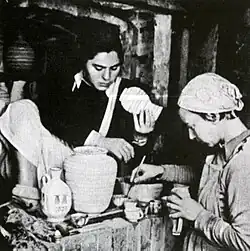 Pots were thrown on potter's wheels mostly in urban areas or in pottery villages. It was a craft traditionally worked by men. In the census carried out on the streets of the land of Israel in 1928 during the British Mandate, 77 pottery villages (of individuals or groups) were listed, while in the 1931 census, 211 different pottery villages were listed.[2] Many of the pottery villages were centralized, based on geographical proximity of the potters' families. Examples of this can be found in the pottery workshops held in the pottery villages in Rashia al Fakhar (Tel Faher) at the foot of Mount Hermon.[3] Or in Hebron, at the various workshops of the Alfahori family. These pots were fired at a low temperature in traditional kilns that burned wood, charcoal, or animal droppings. Different workshops were held in Gaza as well, where they produced unique black pottery (فخار اسود), produced by adding organic materials, such as barley husks, to the kiln or by reduction firing. The smoke from the process of the burning of these materials within the kiln lent the pottery its characteristic black color.[4]