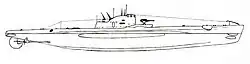 The boats were armed with six 53.3-centimeter (21 in) torpedo tubes, four in the bow and two in the stern for which they carried a total of nine torpedoes. They were also armed with a single 102-millimeter (4 in) deck gun forward of the conning tower for combat on the surface. Their anti-aircraft armament consisted of two 13.2-millimeter (0.52 in) machine guns.[1]