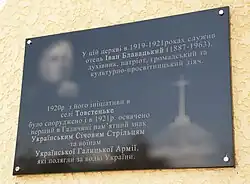 A memorial plaque to Ivan Blavatskyi on the facade of the Church of the Holy Trinity in Tovstenke, where he served in 1919–1921.