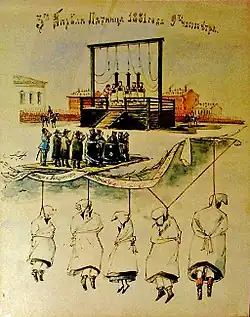 On 13 March 1881 in Saint Petersburg, the reformist Russian Tsar Alexander II was assassinated by a bomb thrown by Ignacy Hryniewiecki, a member of the revolutionary organization Narodnaya Volya. The bomb also seriously injured Hryniewiecki, who died a few hours later. Hryniewiecki's accomplices, the Pervomartovtsy, were executed on 13 April 1881.[2][3] Repin, who visited Saint Petersburg in mid-February 1881 for the opening of the Wanderers' exhibition, was present when the tsar was killed. He returned there in April and attended the execution of the attack's perpetrators and their accomplices.[4]