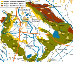 The deposits left by the oldest of the three main glacial pulsations (San Michele - Borgo group) are the outermost and are best identified on the left side of the AMI, in the Biella area of the Serra. The frontal moraine and much of the right moraine have in fact been covered by the debris left by the later phase, which began about 700,000 years ago. During this period the best preserved of the three moraine circles, the Serra d'Ivrea group, was deposited. In addition to the main body of the Serra this includes a large part of the frontal moraine observable today (the area roughly between Moncrivello and Torre Canavese) and part of the reliefs located at the outlet of the Valchiusella. The hilly reliefs due to this glacial phase are the ones that reach the greatest heights partly because they were to some extent curbed by the presence of the moraines left by the previous pulsation, which resulted in a higher elevation than would have occurred in the case of undisturbed deposition on a flat area. The third group of deposits, referred to as the Bollengo-Strambino (or also Bollengo-Albiano), is the most recent and is located within the previous two; it includes some moraine cordons of lesser elevation development as well as the Serretta, a low hill that breaks away from the main body of the Serra near Bollengo.[14]