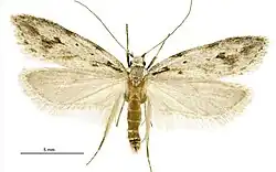 Male. — 21 mm. Head and thorax grey-whitish, sprinkled with fuscous-grey. Palpi grey-whitish, mixed with fuscous, basal half of second joint dark fuscous externally, terminal joint with a slender dark fuscous ring above middle. Antennae grey. Abdomen grey-whitish. Legs dark-fuscous, posterior tibiae with grey-whitish hairs, all tarsi with obscure whitish rings at apex of joints. Forewings elongate, slightly dilated, costa gently arched, apex obtuse, hindmargin oblique, nearly straight; whitish, irregularly irrorated with grey and fuscous scales; these tend to form suffused markings, a spot on middle of inner margin, another above anal angle, a narrow suffusion along posterior half of costa, and an apical patch; a small cloudy darker spot towards hindmargin in middle; a minute black dot in disc at 1⁄3, another slightly above it in middle, and a very small blackish ocellus in disc at 2⁄3 : cilia whitish, with two cloudy grey lines. Hindwings whitish; cilia whitish, with two faint grey lines.[6]