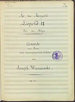 - ^ Piano Study for the Left Hand (without op. n°) for his friend Alexandre Michalowski, 6 Lieder von Józef Wieniawski op. 50 and Prière à la sainte vierge d'Ostrobrama op. 16 (French version of Modłitwa do Najświętszej Maryi Panny Ostrobramskiej), performed in Brussels on October 14, 1895).