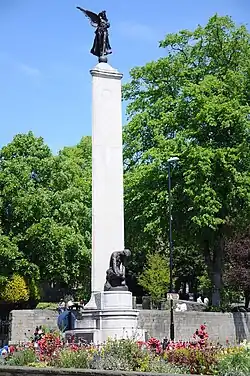 - War Memorial, Watchcote Park, Failsworth, Lancashire (1923); an "unusual" design with an octagonal fluted pillar, decorated with coloured tiles and capped with a bronze wreath and winged Victory figure (grade II)[7][35]