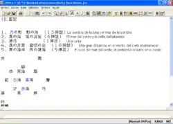 JWPce offers many facilities that are useful to students of Japanese such as detailed kanji information (using KANJIDIC), a built-in Japanese dictionary (using EDICT and similar dictionary files) and various kanji lookup methods. It allows users to translate both to and from Japanese, using either kanji or kana. JWPce can look up kanji by stroke number and by identifying any number of radicals contained within the kanji. Therefore, if you can recognize two or more radicals within the kanji, you can search for all kanji containing all of these radicals. It also contains nine kanji lookup systems.