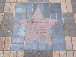 Avshalomov received the Ditson Fellowship in Composition following World War II and a Guggenheim Fellowship in 1951. In 1953 he was recognized by the New York Music Critics Circle for his choral work Tom o' Bedlam.[5] Other awards include a Bloch Award, Naumburg Recording Award, Ditson Conductor's Award in 1965, Governor's Arts Award, and American Symphony Orchestra League Award. In 1994 Avshalomov was named a Portland First Citizen, an honor established by the Portland Realty Board (now the Portland Metropolitan Association of Realtors) in 1928 to recognize "civic achievements and business leadership within the community".[6][9] In 2011 Avshalomov was one of three honorees to be recognized by the Portland Center for the Performing Arts Foundation for outstanding contributions to Portland's art community. Awards recipients had a granite star placed on Main Street by Antoinette Hatfield Hall and were presented with a bronze folly bollard.[6]
