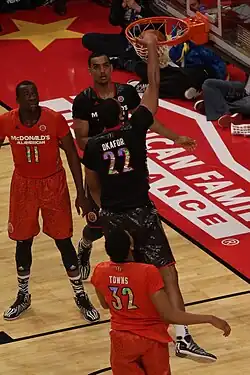 He was selected as the 2014 National Player of the Year from among the 20 Parade All-Americans.[74] He was also recognized by the McDonald's All-American Game organization as its 2014 Morgan Wootten National Player of the Year.[75] USA Today recognized Okafor as its national player of the year when naming its All-USA Boys Basketball Team along with Alexander, Oubre, Mudiay, and Stanley Johnson.[76] Okafor beat Alexander in the Illinois Mr. Basketball voting by a 492–402 vote.[77] He earned first team All-American recognition from MaxPreps on April 13.[78] Okafor was named the 2013–14 Chicago Tribune/WGN Ch. 9 Athlete of the Year.[79]