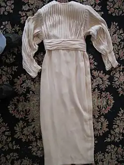 In 1952, James Galanos opened his own company, Galanos Originals, which was immediately ordered by Saks Fifth Avenue and Neiman Marcus in Beverly Hills.[6] He then opened his New York showroom where a Neiman Marcus clothing buyer discovered him and predicted his styles would soon "set the world on fire." Stanley Marcus, the president of Neiman Marcus, agreed and soon proclaimed that the greatest and most treasured luxury in the world for a woman to have would be a dress by James Galanos.[11] Legendary magazine editors and style arbiters such as Diana Vreeland, Eleanor Lambert, Gloria Vanderbilt, and Eugenia Sheppard became fans, ensuring that he would become a household name within months.[12][10] From this first collection, his clothing has been admired for its particularly high quality, especially considering it was ready-to-wear, not custom-made. His chiffon dresses, in particular, made his reputation in the early 1950s, with their yards of meticulously hand-rolled edges. Many designers worked with chiffon, but Galanos was a true master of the genre. He draped chiffon, pleated it, layered it, used flower prints and fabrics with metallic glints. As tailored as a shirtwaist dress or as seductive as a sarong, he gave chiffon a high style all his own. Sometimes he even gilded it, as in his notable pin-striped dress with a three-dimensional jeweled butterfly embroidered on the chest.[13]