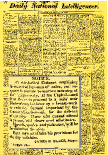 Once the army forces in Washington had surrendered, and most of the city's residents fled, Blake made a desperate last effort to hold off the British, distributing flyers and handbills and placing an ad in the evening newspaper The Daily National Intelligencer, urging "all able-bodied Citizens remaining here" to meet at the steps of the U.S. Capitol and then proceed to an arsenal at Bladensburg, Maryland, to arm themselves and defend the city.[8] It was too late, however, to save the capital from being burned, and Blake himself finally fled across the Potomac River on the night of the 24th when it became evident that his only alternative was to be taken prisoner.