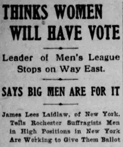 James Lees Laidlaw (December 19, 1868 – May 9, 1932) was a banker, civic worker, and philanthropist. He supported the League of Nations and women's suffrage movement. He was president of the New York State Men's League for Women's Suffrage, which helped women obtain the right to vote on November 6, 1917, and he was a leader in the national men's organization. His was the only man's name that was placed on memorial tablets in Albany and Washington, D.C. in recognition of individual's efforts during the women's suffrage movement.