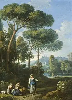His landscapes have an Arcadian lushness, with mountains, streams, distant hamlets, and small inhabitants painted with imprecise pittura di tocco ('painting of touch') using small dotting and spirited brush-strokes.[11] Unlike van Wittel, van Bloemen did not generally depict views of areas distant from Rome such as the Tiber Valley or the Alban hills. His subjects were limited to views in the immediate vicinity of Rome, an outline of which was typically visible in his compositions.[12] Van Bloemen was in particular known for his 'estate views' representing the estates of the nobility in the Roman Campagna. His views aim to associate the modern estate view with the classical arcadian landscape. Rather than offering the wide panoramic views, distant horizon and atmospheric effects associated with topographical landscapes, van Bloemen's estate views emphasize minute observation of reality and a limited viewpoint. The estates are thus made to appear as immutable features of the local landscape.[3]