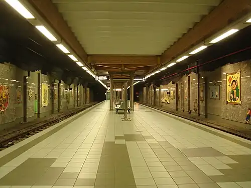 Interior decoration, designed by architect Jean Yernaux, is themed around the Belgian comics characters from Dupuis Publishing, a well-known Belgian comics publishing company based in Marcinelle (part of the Charleroi municipality).