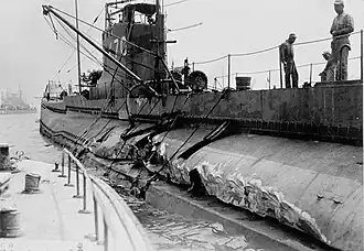 I-69 relieved I-70 as Submarine Division 12 flagship on 26 January 1941, but I-70 resumed her role as division flagship on 30 March 1941.[3] On 12 May 1941, I-70 collided with I-69,[2][3] suffering a long gash forward in her starboard ballast tanks aft almost as far as her conning tower, while I-69 suffered bow damage.[3] Both submarines reached Yokosuka, Japan, for repairs.[3]