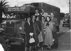 Jasper Maskelyne and his magic troupe departing from Nairobi in 1950. Jasper Maskelyne is on the right, touching the arm of Yvonne Helliwell, his stage assistant.