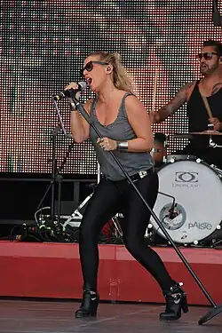 In 2011, German fashion retailer Jeans Fritz engaged Biedermann as a designer and model for their casual brand.[19] The same year, she appeared in the historical television thriller Isenhart: The Hunt Is on for Your Soul. Filmed in Berlin, Vienna and Budapest, it was broadcast to positive reviews and high ratings.[20] In August 2011, Biedermann was awarded the Order of Merit of the Federal Republic of Germany for her social, charitable or philanthropic work as a German Red Cross ambassador.[21] Feeling increasingly exhausted due to her time-consuming career in both music and film, Biedermann decided to withdraw from her public life as a solo artist and founded the band Ewig along with boyfriend Jörg Weißelberg and friend Christian Bömkes.[21] Taking her back to her career beginnings, the band released two German language studio albums, Wir sind Ewig and Indianerehrenwort, in 2012 and 2015, respectively, with both of them reaching the top 50 of the German Albums Chart.[21] In 2015, Ewig represented Brandenburg in the Bundesvision Song Contest with the song "Ein Geschenk", finishing in eighth place.[21]