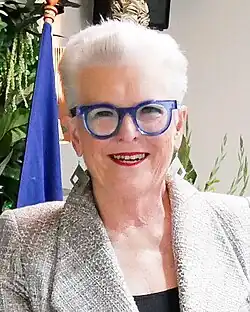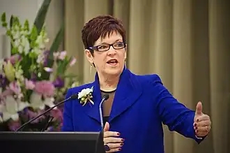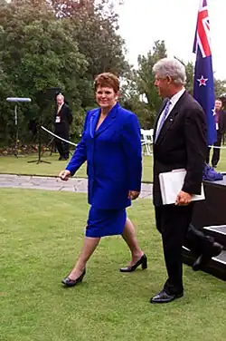 Dame Jennifer Mary Shipley DNZM PC (née Robson; born 4 February 1952)[1] is a New Zealand former politician who served as the 36th prime minister of New Zealand from 1997 to 1999. She was the first female prime minister of New Zealand, and the first woman to lead the National Party.[2][3]