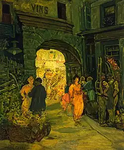 In 1895, Myers found work in the art department of the New York Tribune. With savings of two hundred and fifty dollars from this job, he traveled to Paris in 1896. Upon his return to New York City, with only twenty dollars left, he rented, for seven dollars a month, a studio at 232 West 14th Street in a former five-story mansion, "equipped with a skylight and converted to the use of artists."[6] There, his next door neighbor was Edward Adam Kramer, a painter just one year older than Myers himself. While Myers' art training had been limited to short stints at New York's Cooper Union and the Art Students League, Kramer had acquired his education in the European art centers of Munich, Berlin, and Paris. It was Kramer who ushered Myers into the world of the professional artist. One day, when the art dealer William Macbeth arrived at Kramer's studio to view work, Kramer directed him to Myers' studio as well. Macbeth purchased two small paintings of his early New York street scenes from Myers on the spot, and simultaneously recommended that he bring additional work to the gallery. Macbeth thought highly of these two paintings and, taking them to his gallery, soon sold one to the banker, James Speyer. As an early critic for the New York Globe stated: "Myers' reputation dates from that purchase."[7] Macbeth also suggested that Myers relinquish drawing in pencil and pastel and turn to oils. In the years following 1902, Myers sold work through the Macbeth Gallery and exhibited in group shows at other venues. In March and April 1903, when the Colonial Club of New York held its annual art show, Exhibition of Paintings Mainly by New Men, among the twenty artists included were Robert Henri, John French Sloan, and Myers, showing their works together for the first time.