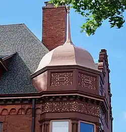 The building is an example of German Renaissance Revival style. The building is considered a villa. The wealthy Germans in the Milwaukee area built many homes in the style. The home has a brick facade and arcaded corbeling which are typical of this German revival style. The ornamental iron work was done by Cyril Colnik. The home is considered to be one of the first to have zoned air conditioning system.[2] The home has 16 rooms: five bedrooms, four and a half baths. The front of the building features an octagonal bartizan. The front porch has large stone arches. The interior of the home has stained glass windows in every room, woodwork throughout and a multiple fireplaces. The floors are adorned with beautiful inlaid wood. The home's parlor is replete with Honduran mahogany.[3]