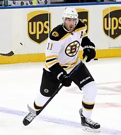 As a restricted free agent, on July 1, 2015, the Panthers traded Hayes to the Boston Bruins in exchange for Reilly Smith and the contract of injured Marc Savard.[13] On July 6, 2015, Hayes agreed to terms on a three-year contract with the Bruins worth $2.3 million per year.[14] Hayes' first goal as a Bruin came on October 14, 2015, in a 6–2 road victory against the hosting Colorado Avalanche.[15] Just over two months later, in the second game of a home-on-home series against the Ottawa Senators, Hayes scored his first-ever NHL hat trick against Senators' goaltender Craig Anderson, as the initial, fifth and seventh Bruins goals (the seventh scored with only 0.2 seconds of game time remaining) for a 7–3 home ice Bruins win.[16]