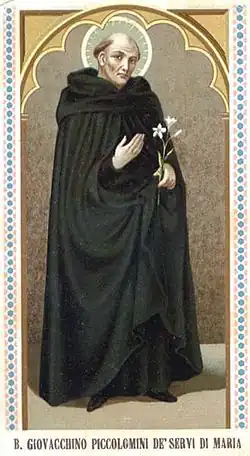 Despite his family's reservations, Piccolomini joined the Servites as a lay-brother at the age of fourteen, taking the name Joachim, reflecting his devotion to Mary. He became a spiritual student of Philip Benizi. In the monastery he distinguished himself by his devotion and kindness. On Saturdays, Joachim abstained from all food in honor of the Seven Dolours of the Virgin.[4] His fervor grew, yet instilled in him an extraordinary humility. Joachim was urged by his brothers to study and be ordained a priest, but he felt he was unworthy, and wanted nothing grander than to be an altar server.[5]