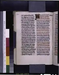 ![]() Opening of John XIII with 2-line initial, written with verses alternating red and blue. Bibliotheca Swaniana, 13th century. | |