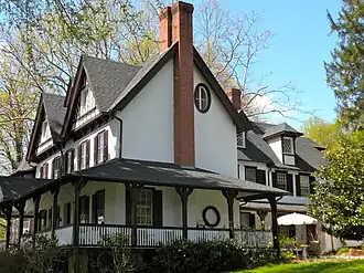 This historic complex was originally built during the 1840s and then extensively remodeled in 1889 in the Queen Anne style. The original house consists of the two-story, five-bay, stone central block with two-story service wing. When remodeled, the roof received a cross-gable and dormer windows. Also added was the two-story library wing, kitchen extension, and two-sided porch. Also located on the property are a contributing spring house, tenant house, corn crib, and barn.[2]