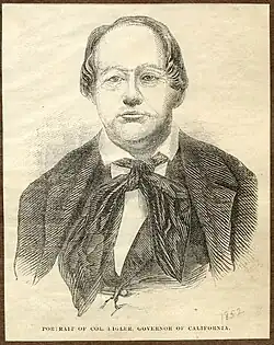 Pressure was also mounting on the Democratic Party itself in California in regards to slavery. By the 1853 general election campaign, large majorities of pro-slavery Democrats from Southern California, calling themselves the Chivalry (later branded as Lecompton Democrats), threatened to divide the state in half should the state not accept slavery. Bigler, along with former State Senator and Lieutenant Governor David C. Broderick from the previous McDougal administration, formed the Free Soil Democratic faction, modeled after the federal Free Soil Party that argued against the spread of slavery. The Democrats effectively split into two camps, with both the Chivalry and Free Soilers nominating their own candidates for the 1853 election.[9] Despite the party split, Bigler was able to overcome Whig Party challenger William Waldo and became the first California governor to win a second term in office. No other governor of the state would win a second term until Hiram Johnson in 1914.