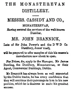 Towards the end of 1892, the Monasterevan Distillery advertised that they had "secured the service of the well-known Distiller, Mr. John Brannick, Late of Sir John Powers and the DWD Co Distillery, Jones' Road", asserting that Brannick "has always been so well supported by the Dublin trades, he has every confidence that they will continue their patronage to him in his new position, which he is desirous to make his greatest success".[13] According to Brannick's 1893 testimony as a witness in litigation against the Dublin Whiskey Distillery following the accidental death of an employee, he remained a shareholder in that company, and after serving as managing director of the Banagher establishment, was then a distiller at Cassidy's, Monasterevan, "where he had 100 men employed".[14] In January 1895, it was reported at the Ballickmoyler Petty Sessions for the 11th of that month that Brannick was "appointed sole general manager as well as distiller" of Monasterevan Distillery, taking the place of the recently deceased James Dowling.[15]