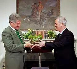 Bruton, a passionate supporter of European integration, was chosen as one of the two Irish Parliament Representatives to the European Convention, which helped draft the proposed European Constitution. He was one of two National Parliament Representatives to sit on the 12-member Praesidium, which helped steer the European Convention. He was a member of the Comité d'Honneur of the Institute of International and European Affairs, along with Peter Sutherland and Bertie Ahern. He served as a vice-president of the European People's Party (EPP).[10] He accepted an offer to become European Union Ambassador to the United States, in the summer of 2004, and after resigning from the Dáil on 1 November 2004, he assumed that office.[11] Bruton was praised by Ahern, who said Bruton had played "a pivotal role in developing Ireland's relations with the European Union."[12]