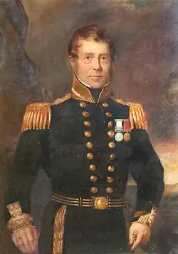Carter served for a time aboard HMS Victory under Vice-Admiral Lord Nelson, and in February 1805 Nelson transferred him into an acting-lieutenancy aboard the 74-gun HMS Leviathan.[1] Admiral Lord Nelson awarded him with his sword and telescope for distinguished service under his command.[3] Carter then took part in the pursuit of the combined Franco-Spanish fleet to the West Indies during the Trafalgar Campaign.[1] He returned with the British fleet and took part in the Battle of Trafalgar, where his service involved securing the prisoners and destroying the prizes.[1] He was back in the West Indies by late 1806, where he navigated the badly leaking HMS Cerf back to Britain, fothering her hull with sails and with the pumps manned all throughout the voyage.[1] He captured the 14-gun Emille off St Valery in February 1814.[4] He was promoted to post-captain on 7 December 1815, and went on to become superintendent of the Royal Hospital Haslar after the end of the Napoleonic Wars.[4]