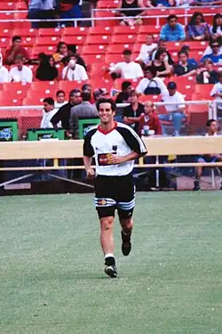 John Harkes played in the 1990 and 1994 FIFA World Cup Harkes made his national team debut on March 23, 1987, against Canada. He was on the U.S. team at the 1987 Pan American Games.[16] He quickly established himself as a national team regular and was selected for the 1988 Olympics. That year the U.S. went 1–1–1 and failed to qualify for the second round. Harkes continued to play for the national team as it went through the qualification process for the upcoming World Cup. The team qualified for those games after an improbable 1–0 road victory over Trinidad and Tobago in the final qualification match.