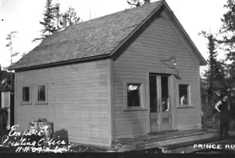 John Houston arrived in Fort George in the fall of 1909 and bought property in South Fort George and began the Fort George Tribune. The first edition was published on November 6, 1909. Unfortunately, other than land claims notices there was little local news for his paper to report. In 1909, South Fort George was a First Nations village, a sawmill and a Hudson's Bay Store. Less than a dozen new residents lived in the infant town-site in tent shacks. The Grand Trunk Pacific Railway, John's favorite villain, was still far away: not even across the Alberta/BC border on the eastern end of construction, and the construction from the western end at Prince Rupert had just begun. John's South Fort George articles were often humorous and included notices as to whose cow recently had a calf and what he'd had to pay for eggs that week. He commented in one article about how his socks often froze to the floor while he sat at his printing press and worked on the newspaper. Nevertheless, whether there was little news to report or not, John was a busy man from November 1909 to March 1910. He responded to approximately 300 letters a month, written mostly by parties interested in purchasing land in the area, and he was working on formulating a platform for the Liberal Party. In March 1910, the work and excessively cold caught up with him and John contracted pneumonia and was pulled on a toboggan down the Blackwater Trail to the Quesnel hospital by his friend and fellow pioneer settler, William J Cooke. John died on March 8 at the hospital in Quesnel, but not before he got a chance to read his own obituary, one printed in error by the Vancouver Province. His nurse, knowing his sense of humor, showed him the article, and he supposedly joked that he respected the paper and that they didn't need to make a correction because he was planning on making good on their story. John was laid to rest in Nelson, where there is a memorial in his honor.