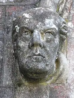 Rolle died in 1842 at Bicton House in Devon.[35] As part of her re-building of Bicton Church as St Mary's Church, completed in 1850, his widow Louisa retained as a Rolle mausoleum part of the ruins of the ancient Church of the Holy Trinity on the site and erected therein an elaborate monument to the memory of her husband, designed by Pugin and sculpted in the London workshop of George Myers. It consists of a Gothic-style chest tomb in front of a high arch filled-in with Gothic-style tracery and sculpted figures. In the same mausoleum is the baroque monument to his distant cousin Denys Rolle (1614–1638), who had inherited Bicton from his mother Anne Denys. He was third in descent from John Rolle (died 1570), the eldest son and heir of the patriarch George Rolle (died 1552) of Stevenstone, MP for Barnstaple. The Rolle Mausoleum is the private property of Lord Clinton and is not open to the public as from 2012.