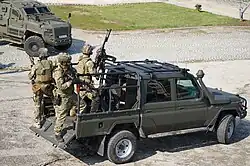 The command's main units are the 3rd,86th and 68th Special forces Groups (formerly battalions) based in Plovdiv, with the 1st Special Operations Group being formed in the capital Sofia.[11] The JSOC is in the process of acquiring 100 Rila MRAPs manufactured locally, with 45 units delivered as of 2021.Rila Xtreme MRAP[12] is a family of 4X4 and 6X6 specialized armored vehicles developed by the Canadian armed vehicles manufacturer International Armored Group founded in Richmond Hill, Ontario by the Bulgarian engineer Dr. Anton Stefov.[13] The manufacturing of the vehicles takes place in Samokov by SamArm[14] - an equal shares joint venture between International Armored Group and Samel 90, a Bulgarian military supplier specialized in communication systems.[14][15][16] The model is named Rila after Bulgaria's highest mountain range. The model family also includes an 8X8 armored personnel carrier, which suggest a possible interest by the Bulgarian Army.[17]