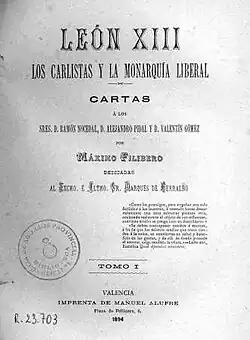 Relatively unknown beyond the Traditionalist Levantine circles, in 1894–95 Corbató was elevated to nationwide celebrity.[34] It was because of his 1894 booklet León XIII, los carlistas y la monarquía liberal.[35] Resembling an earlier pamphlet of Félix Sardà y Salvany, it was a most intransigent interpretation of papal teachings and contained onslaught on liberal and conservative politics; the booklet presented Carlism as the sole depositary of Catholicism[36] and lambasted various breeds of traitors.[37] León triggered legal action as Corbató alleged that the regent, Maria Christina, was heading the Spanish freemasonry.[38] The cause turned into a scandal and was attentively followed by national press; even the prime minister Sagasta admitted to having read the pamphlet.[39] Corbató was expulsed from the Dominican order, the first such case ever recorded in Spain.[40] In 1896 he was sentenced to 11 years in prison and huge financial penalty.[41]